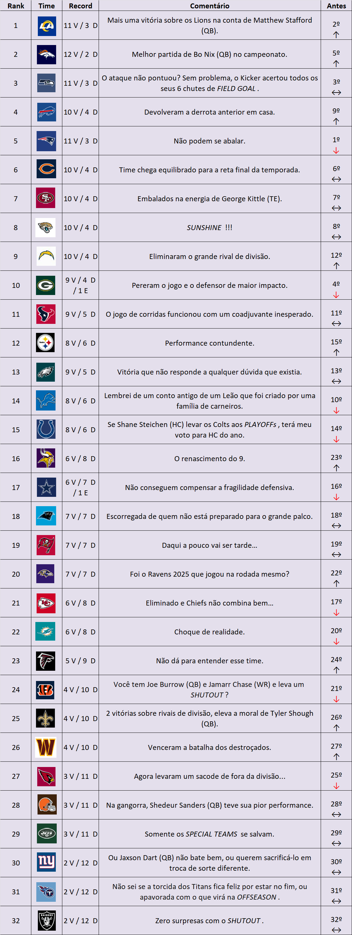 NFL Power Ranking 2025 - Semana 15